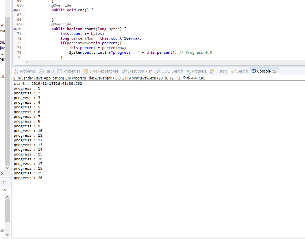 재미있는 기능 중 1가지는 SftpProgressMonitor 라는 인터페이스를 통해서 파일전송 진행현황(프로그래스, Progress)을 볼 수 있다.